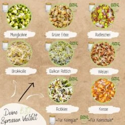 Das Keimsprossen-Samenset aus biologischem Anbau ist ideal für diejenigen, die nach einer einfachen Möglichkeit suchen, ihre Ernährung mit frischen Sprossen und Microgreens zu bereichern. Mit den enthaltenen acht Sorten kannst du eine Vielzahl von Sprossen und Microgreens anbauen und dich geschmacklich so richtig austoben. In der schönen Geschenkverpackung befindet sich außerdem eine ausführliche Anleitung, damit du ohne viel Aufwand und Erfahrung sofort loslegen kannst.