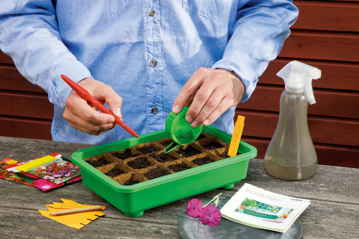Das Profi-Anzucht-Set von Romberg enthält alle Hilfsmittel für die Pflanzenanzucht. Das Sägerät ist einfach zu handhaben und ermöglicht eine optimale Verteilung des Saatguts. Die Größe der Öffnung ist für verschiedene Saatkörner geeignet. Mit dem Pikierstab lässt sich die Erde in den Töpfen gut auflockern. Das dünne Ende des Stabes dient zum Pikieren von Sämlingen mit kleinen Wurzelballen. Die Stecketiketten helfen bei der Kennzeichnung der Aussaat. Die Broschüre „Profi-Tipps für Hobbygärtner“ beinhaltet hilfreiche Tipps rund um die Pflanzenanzucht.