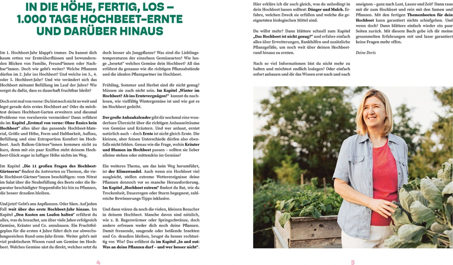 Auf über 200 Seiten erklärt dir Autorin Doris Kampas alles zu den Themen Standort, Bewässerung, Bepflanzung, Fruchtfolge, Ernte und mehr. So bist du allen Herausforderungen gewachsen und kannst über viele Jahre hinweg das Beste aus deinem Hochbeet herausholen.