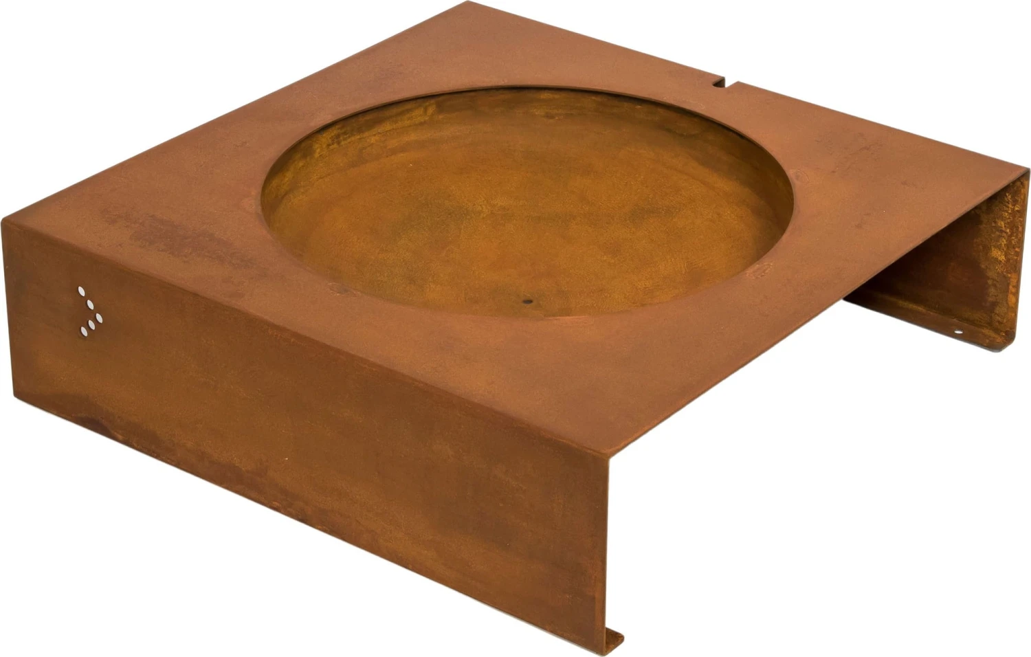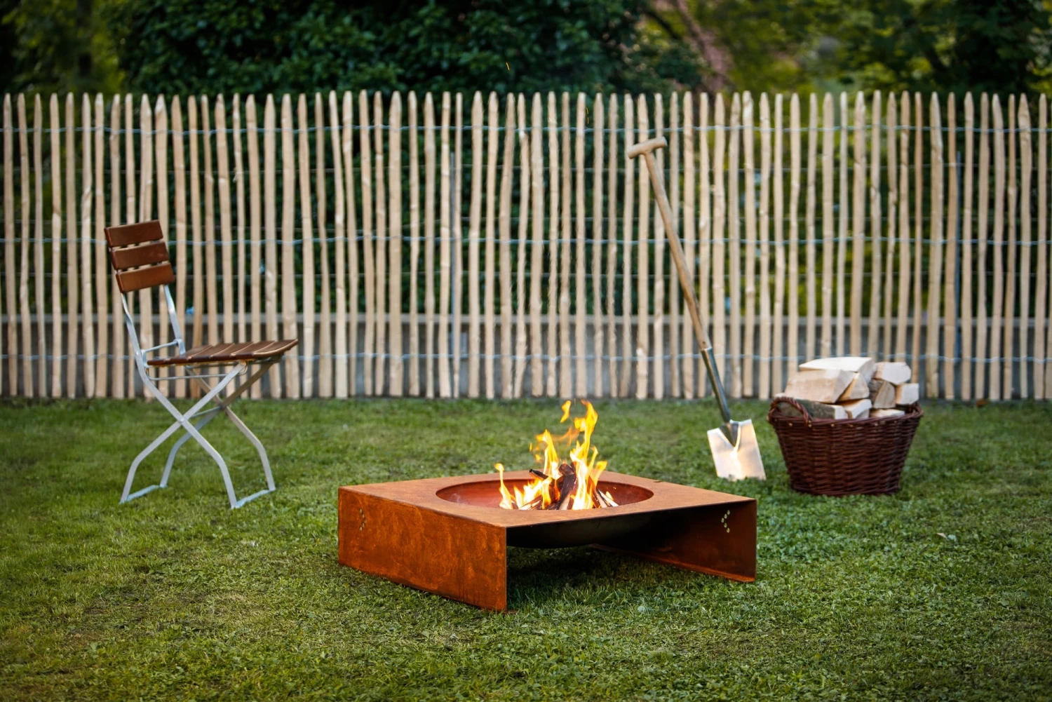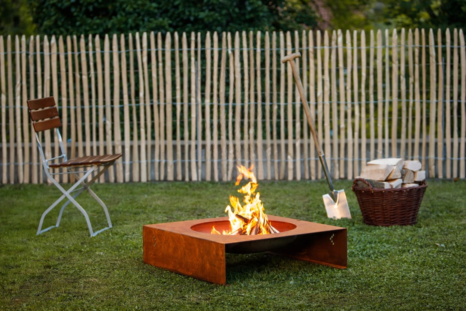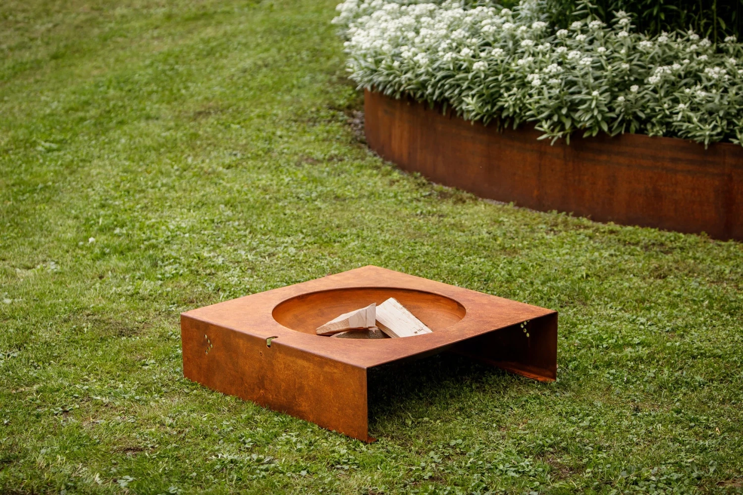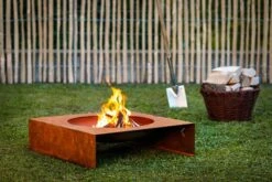 Die Feuerstelle „light-my-fire“ bietet ein spannendes Zusammenspiel der gegensätzlichen geometrischen Formen Kreis und Quadrat. Sie wurde aus 3 mm dicken wetterfesten Stahl gefertigt, somit kann sie das ganze Jahr über draußen stehen bleiben.