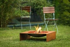 Durch die Witterungseinflüsse entwickelt die Feuerstelle bzw. der Grill mit der Zeit, auf der anfangs noch stahlgrauen Oberfläche, eine einzigartige Rostoptik. Ein absoluter Hingucker an lauen Abenden im Garten!