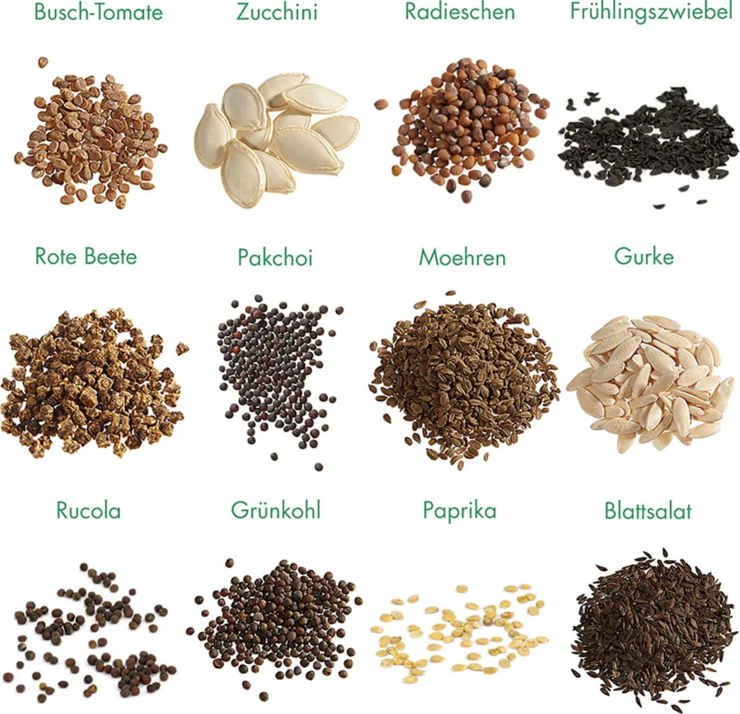 Gurke, Busch-Tomate, Möhre, Radieschen, Schnittsalat, Zucchini, Grünkohl, Pak Choi, Frühlingszwiebel, Rucola, Paprika, Rote Beete