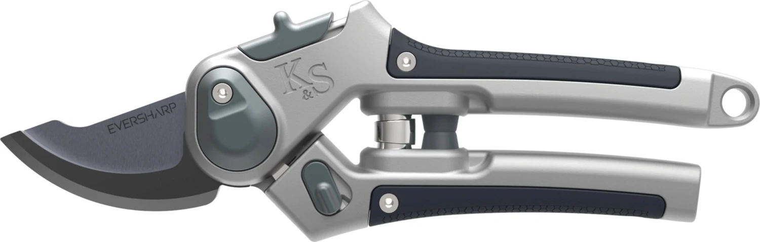 Mit der Gartenschere „Eversharp Bypass Lite“ wird die Gartenarbeit zum Kinderspiel. Das leichte Aluminiumgehäuse und die angenehme Größe kommen vor allem kleineren Händen zugute. Die scharfen Klingen schneiden selbst lebendes Gehölz mit Leichtigkeit und sorgen somit für ein schnelles Vorankommen. Dafür zuständig sind die scharfen Klingen aus beschichtetem Carbonstahl. Der gummierte Griff liegt dabei gut in der Hand und sorgt für den passenden Grip.