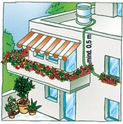 Falls nur ein Hochtank in Frage kommt muss dieser pro 5 m Schlauchlänge, mindestens 0,5 m höher als die Tropf-Blumat-Anlage stehen. Bei 10 m Schlauch also mindestens 1 m.