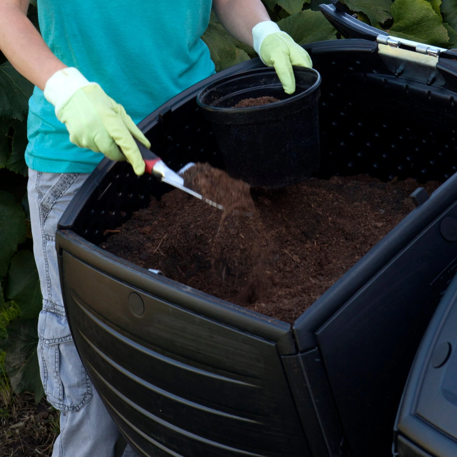 Die Höhe von etwas mehr als einem Meter ermöglicht angenehm rückenschonendes Arbeiten, während die großzügig dimensionierte Öffnungsklappe einfaches Befüllen und Entleeren erlaubt. So einfach und unkompliziert war die Herstellung von Kompost noch nie.