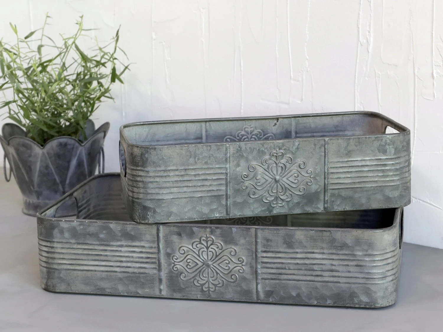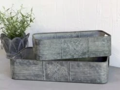 Dieses reich verzierte Pflanz- und Dekogefäß wurde aus robustem Zink gefertigt und bietet genügend Platz zum Verstauen deiner Utensilien. Aber auch Kräuter oder Zierpflanzen lassen sich darin optimal in Szene setzen und werden garantiert zum Blickfang in deinem Zuhause. Sehr praktisch sind zudem die seitlichen Griffe, mit denen du das Gefäß jederzeit hochheben und an einen Ort deiner Wahl stellen kannst.