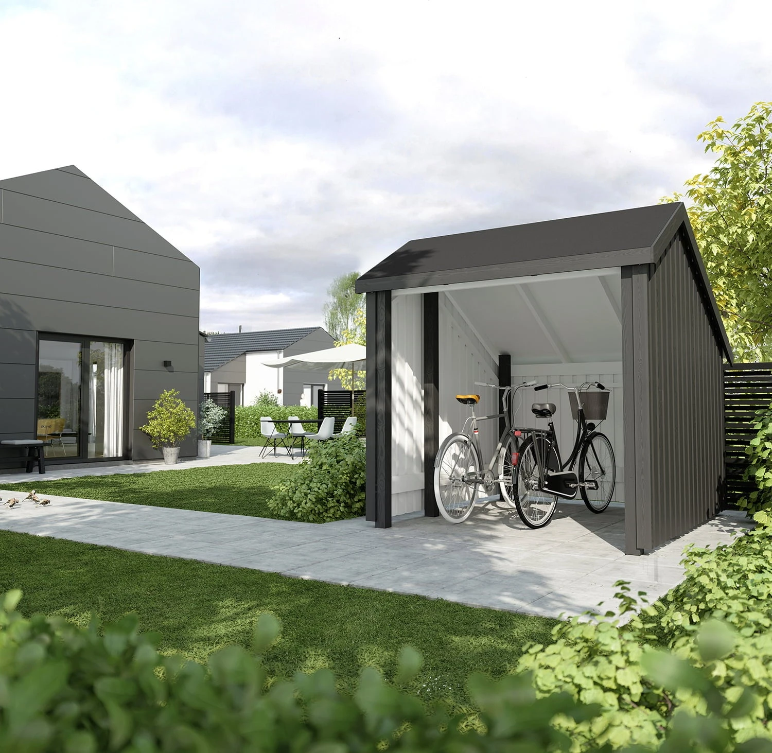 Unter diesem geräumigen Fahrradunterstand aus hochwertigem Nadelholz sind Drahtesel, Laufrad & Co. jederzeit gut geschützt. Skandinavisches Design trifft auf Funktionalität, so dass er sich sowohl im Garten als auch neben Garage oder Carport ausgesprochen wohl fühlt. Für eine einfache und unkomplizierte Montage werden Giebel und Seitenteile bereits vormontiert geliefert.