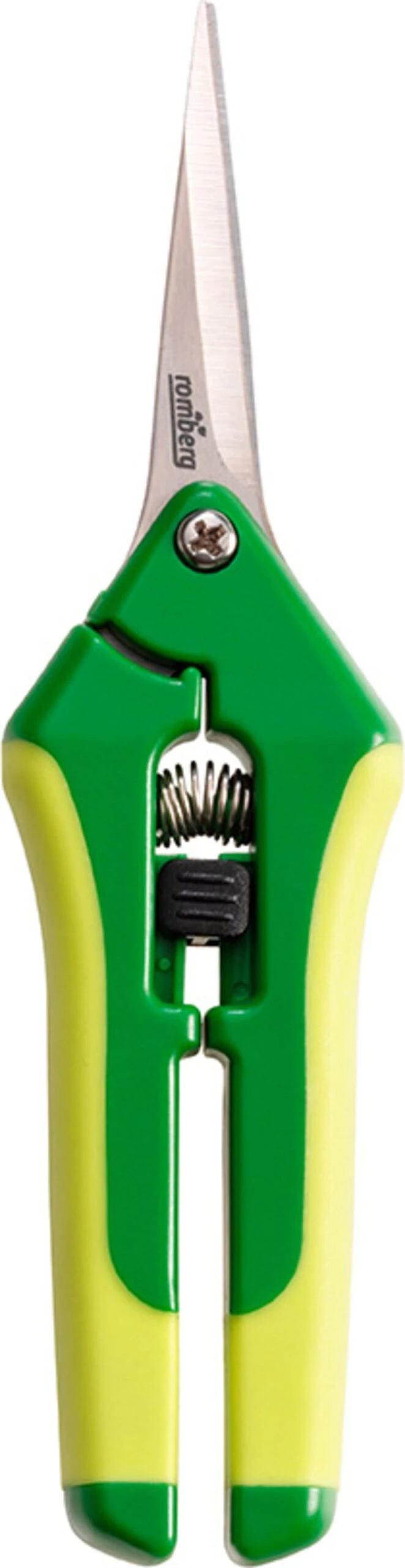 Die leichte Ernteschere verfügt über scharfe und spitze Klingen. Die Griffe sind ergonomisch geformt und ermöglichen ein sicheres Handling. Das geringe Gewicht und der Federmechanismus unterstützen den Gärtner bei lang andauernden Erntearbeiten.