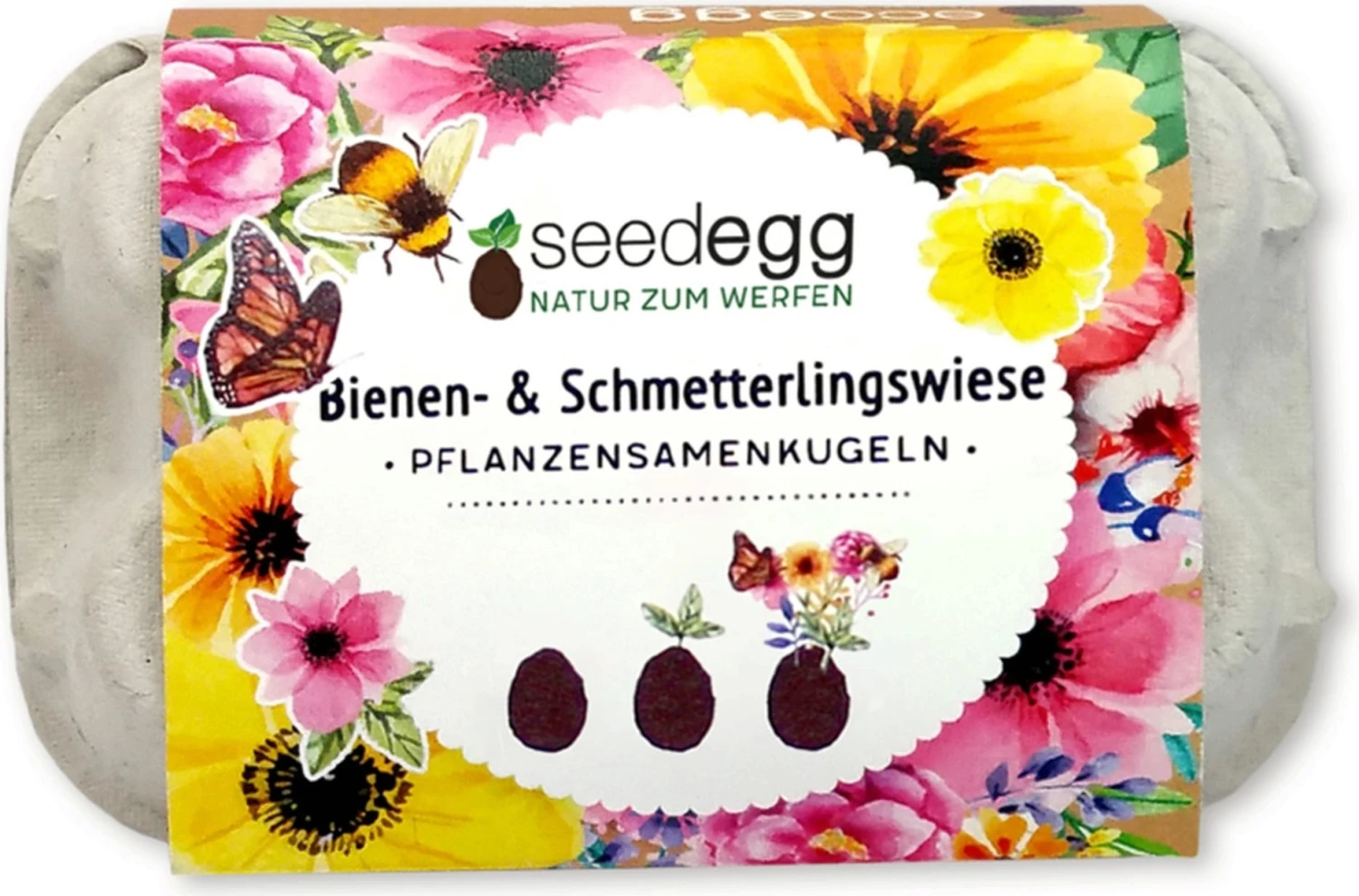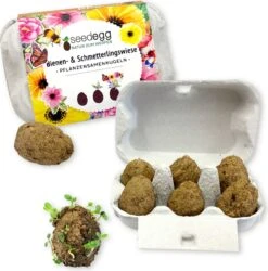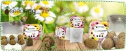 Die handgemachten Wildblumenwiese-seedeggs enthalten eine Auswahl an Pflanzensamen aus biologischem Anbau, das fortwährend Nektar aus pollenreichen Hülsenfrüchten und Wildblumen liefert und eine lohnende Honigernte garantiert. Die Auswahl der Pflanzen wurde bewusst so gewählt, dass sie zu unterschiedlichen Zeiten blühen. Es gibt also immer eine kleine Stärkung für unsere fliegenden Freunde!