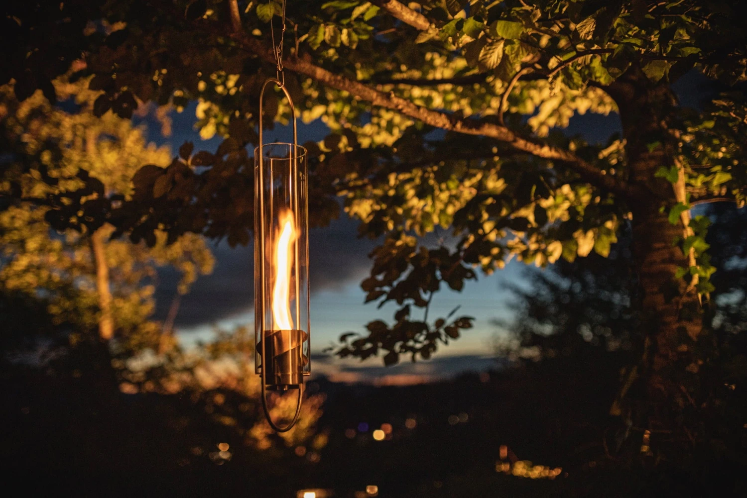 Die Befeuerung funktioniert unkompliziert und schnell: Die Nachfülldose wird mit nachhaltigem Bioethanol gefüllt, das Hängefeuer an der gewünschten Position angebracht und angezündet. Sobald der Glasbehälter aufgesetzt wird, beginnt das Feuer zu rotieren. Mit einer Füllung brennt die Flamme etwa 60 Minuten, um das Feuer vorzeitig zu beenden, kann der funktionale Löschdeckel genutzt werden.