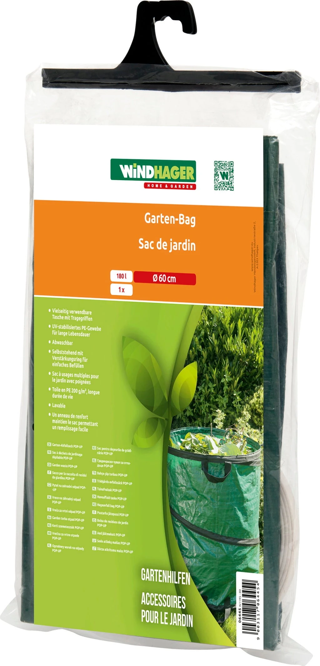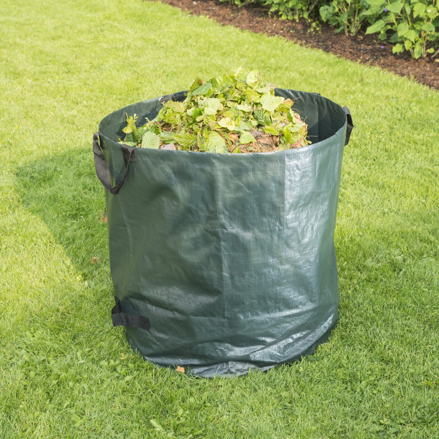 Vielseitig verwendbare Tasche mit Tragegriffen für Gartenarbeiten. Robustes, UV-stabilisiertes PE-Gewebe (200g/m²) für lange Lebensdauer. Selbststehend mit Verstärkungsring und großem Öffnungsdurchmesser zum einfachen Befüllen.