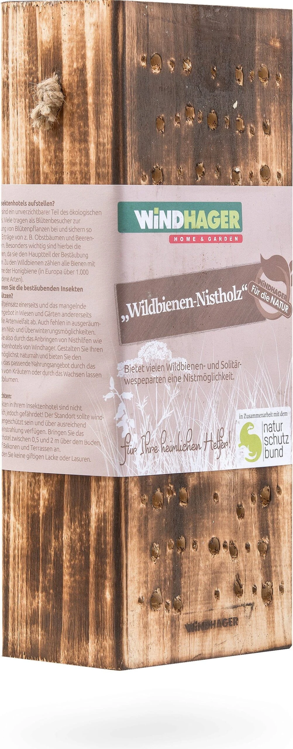 Die in ihrer Art bereits bedrohten Wildbienen finden in diesem Block Schutz und ausreichend Platz zum Nisten. Durch die unterschiedlich großen Durchmesser der Löcher können sich mehrere Wildbienenarten hier ansiedeln.